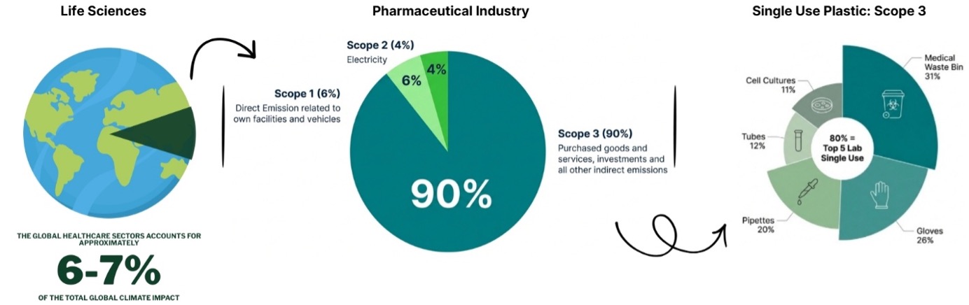 Much of the ~5.5 million tonnes of single use plastic waste generated through lab research is managed through disposal pathways that generate high amounts of GHG emissions, making waste reduction a key lever for lowering emissions from labs (Urbina, 2015). These emissions are classified as indirect, or “Scope 3” GHG emissions according to the Greenhouse Gas Protocol. In the life sciences sector, Scope 3 emissions account for 75–88% of total emissions, highlighting the importance of reducing emissions associated with the purchase, use, and disposal of lab plastics (MGL, 2025).