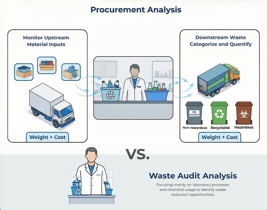 Waste audits and procurement data offer two different and complementary ways to understand plastic use in laboratories. The UU study focused on procurement-based data, supplemented with additional information.