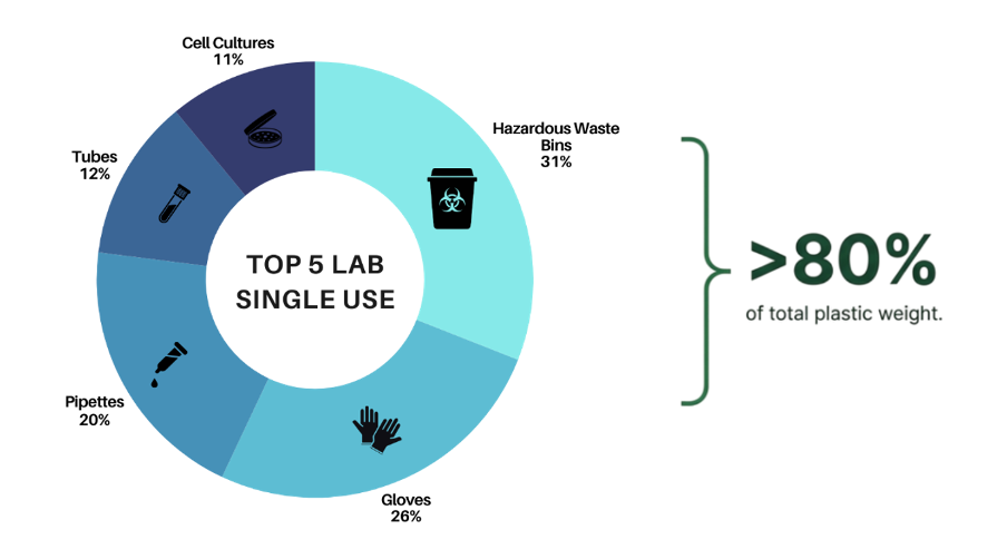 Globally, plastic production and disposal are responsible for ~3% of total GHG emissions (Ritchie, 2023). Available lab waste data suggests labs contribute significantly through single-use plastic consumables.